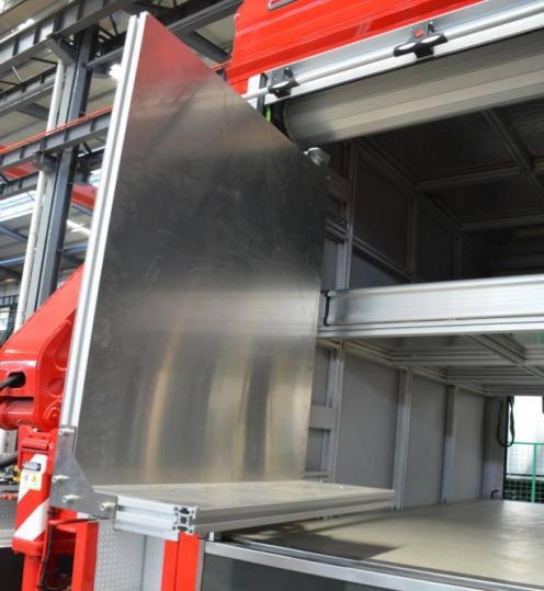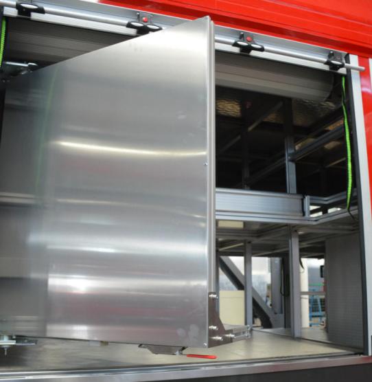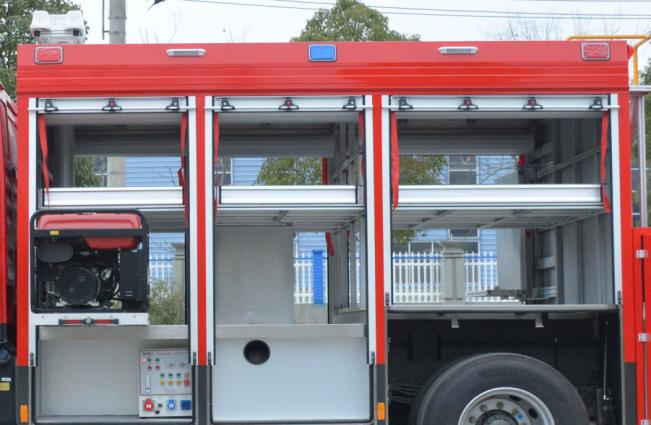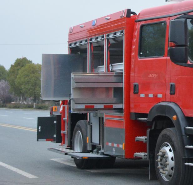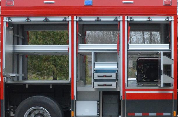右側后器材艙布置有立式旋轉拓展板,前板裝配有雙層器具收納盒,收納存放小型工具和專用器材,背板采用掛式支架,收納專用扳手、卡鉗、剪刀等器具;右側前器材艙布置有立式抽拉拓展板機構,采用重型多節滑軌抽拉式結構,方便消防員快速取用/收納器材和專用工具等。
