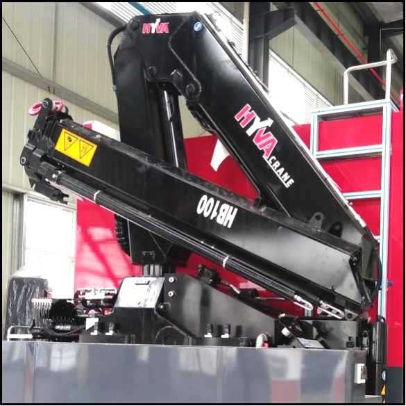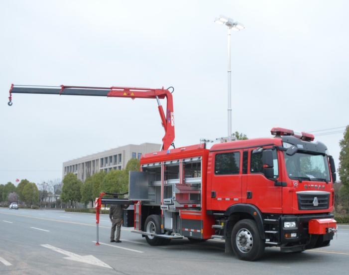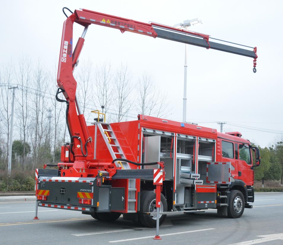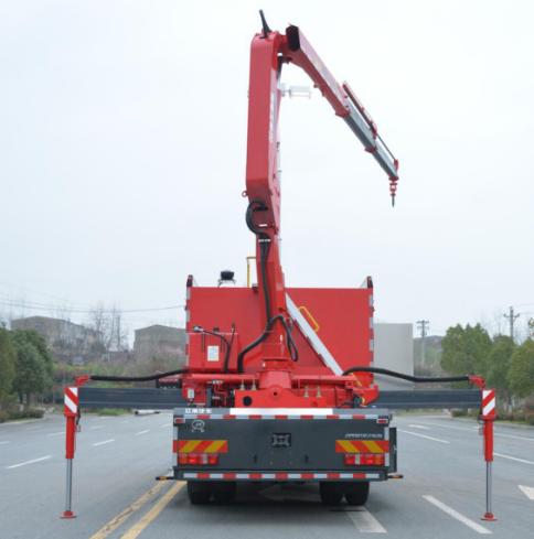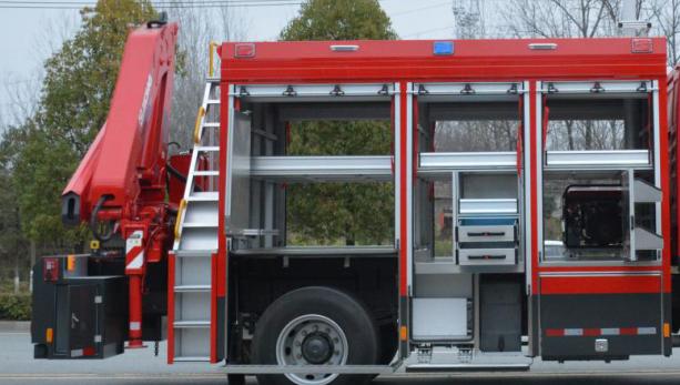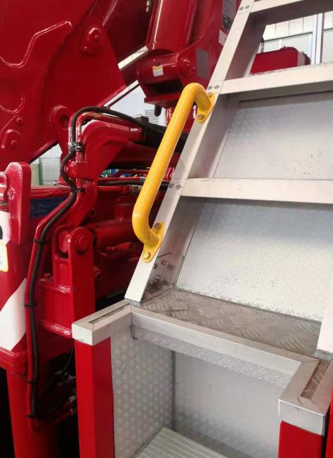 吊裝作業區主要裝備折疊臂吊裝設備,配備有伸縮臂液壓支腿及雙側操控接口,吊裝作業區左右側均配備有器材艙,放置支腿墊木等隨車器材裝備,右側還設計有登頂梯臺,配備上車拉手及安全護欄。
