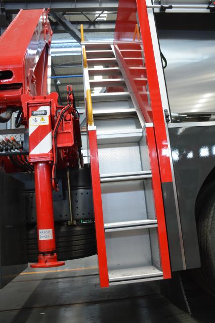 梯臺、扶手及護欄:為便于取用/收納應急救援裝備器材,符合安全和人機工程要求,本車根據實際使用需要,設計有各種梯臺、扶手、安全護欄等輔助設施。