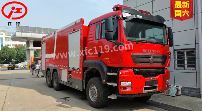 國六豪沃六驅消防車采用重汽豪沃ZZ5357V455GF1六驅原裝底盤改裝而成,整車由消防員乘員室和車身兩大部分組成,乘員室為原裝單排,可乘坐1+2人,該車為外露罐結構,車身前部為器材箱,中部為罐體,后部為泵房。載液罐體為優質碳鋼,內部噴涂環氧底漆及環氧瀝青漆,與底盤采用彈性連接,罐體容積17.55立方,水罐容積:15.250立方米,泡沫液罐容積:2.300立方米,裝備了上海茸申消防設備有限公司生產CB20·10/30·60-RS型中低壓消防泵,額定流量60L/S,車頂安裝成都威斯特消防機械有限公司生產的PL8/48型車用消防炮。該車最大的特點是全地形車型,適合于各種復雜路面,載液量大、操控性好、維修簡便。可廣泛應用于森林,復雜地形,公安消防隊、廠礦企業及社區、碼頭等場所,撲救大型油類火災和一般物質火災。